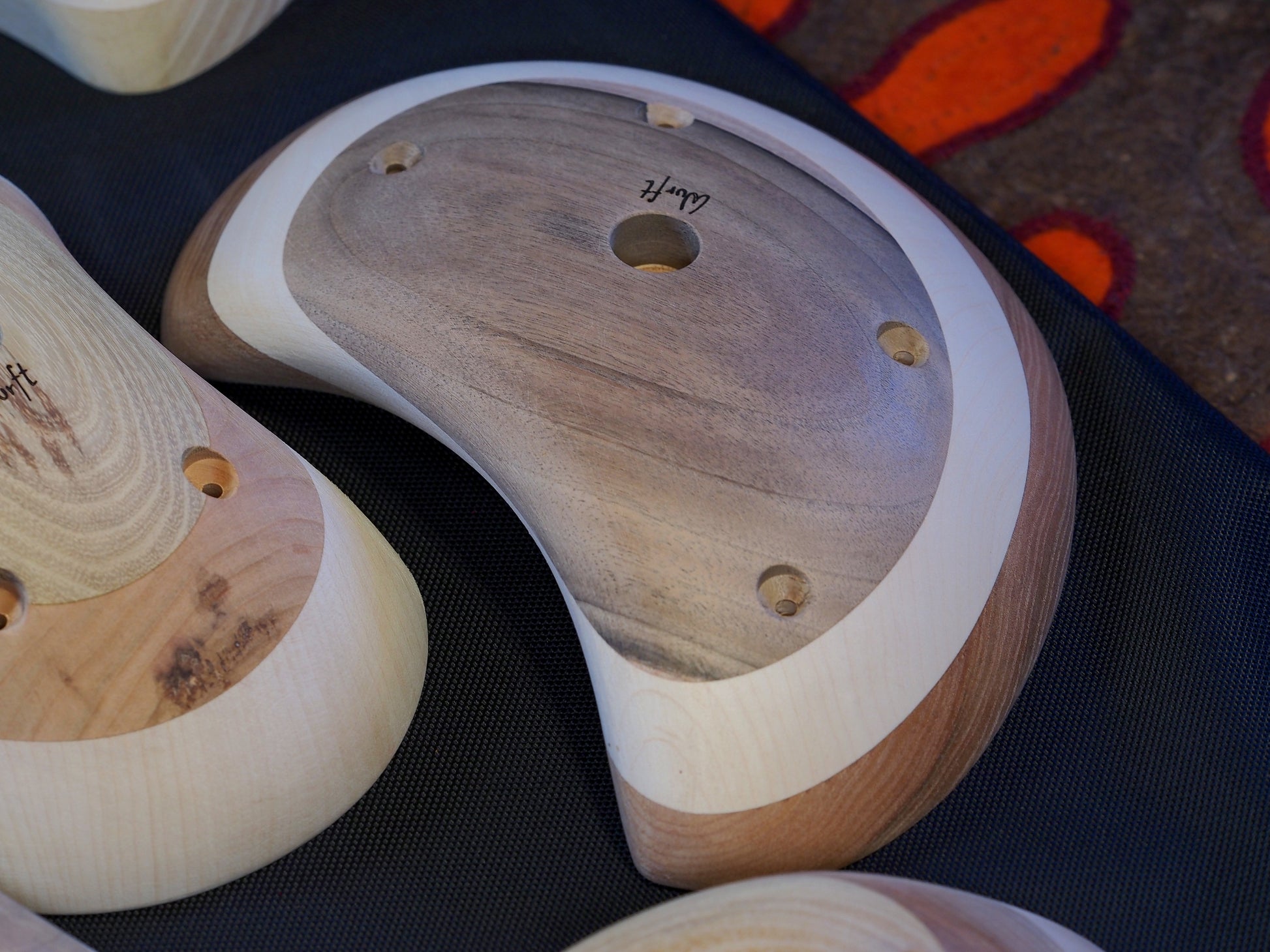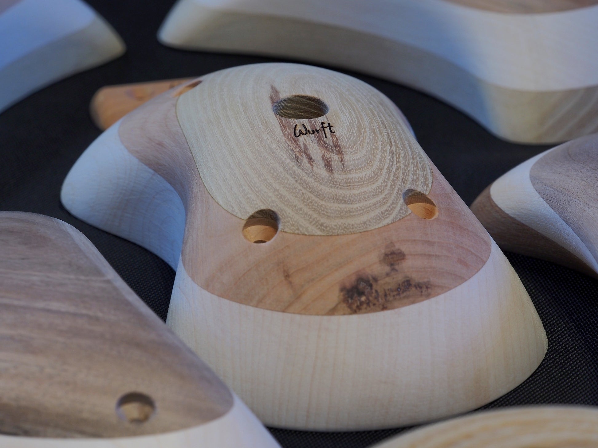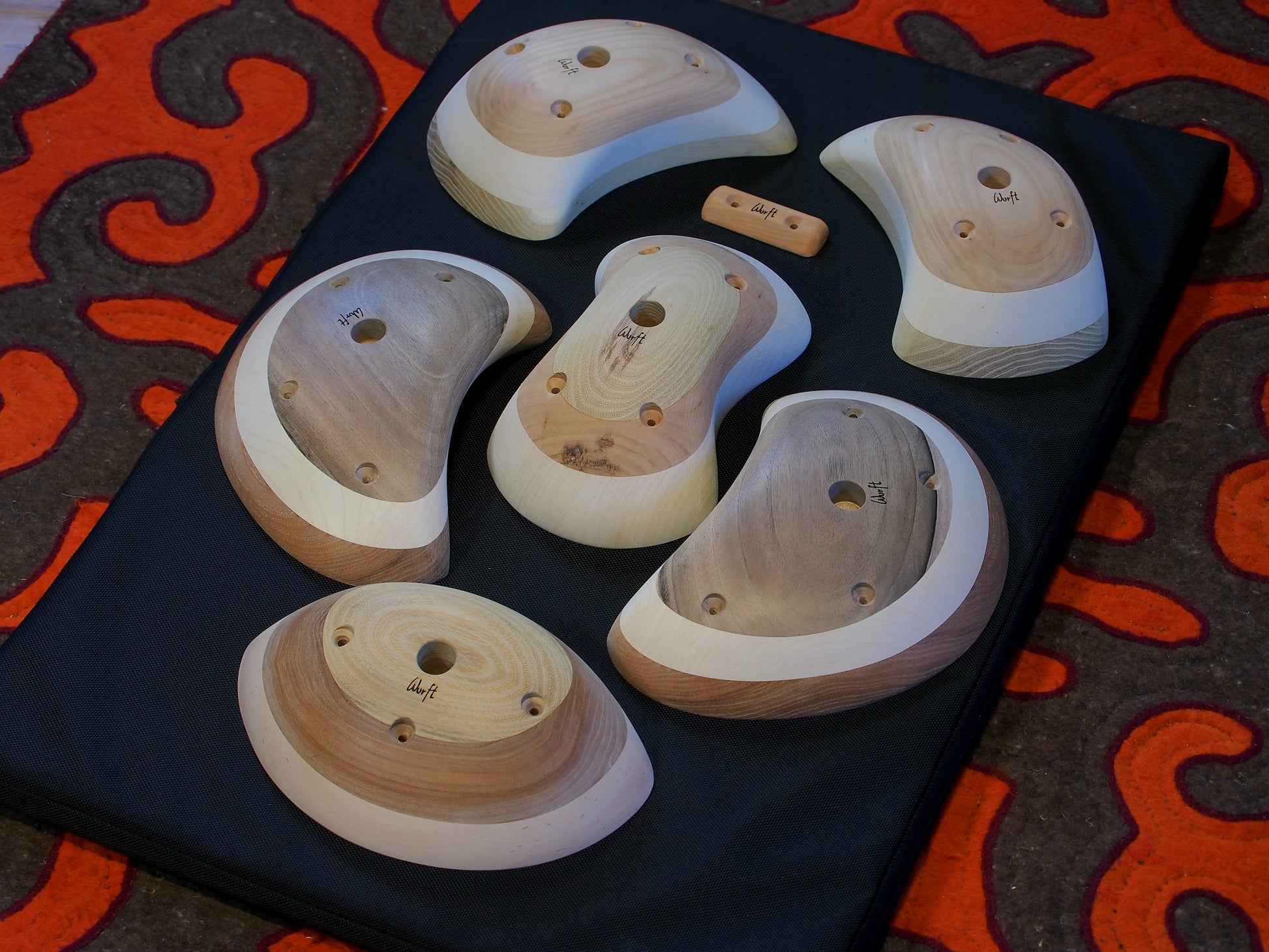 All holds are made from locally sourced hardwood (except the crimp) and can be used as screw-on holds. Big holds also have a hole for an M10 countersunk bolt. Hardware is not included.
