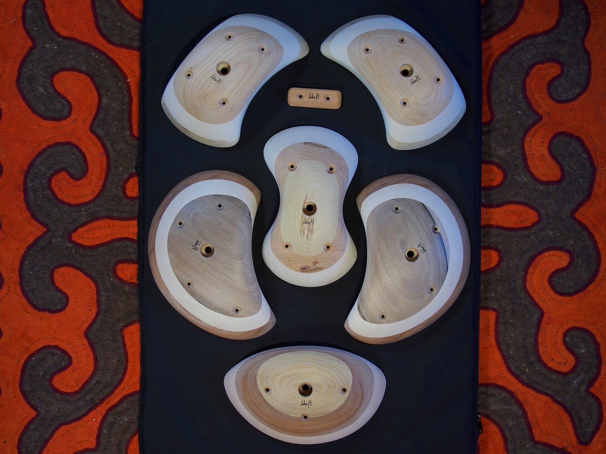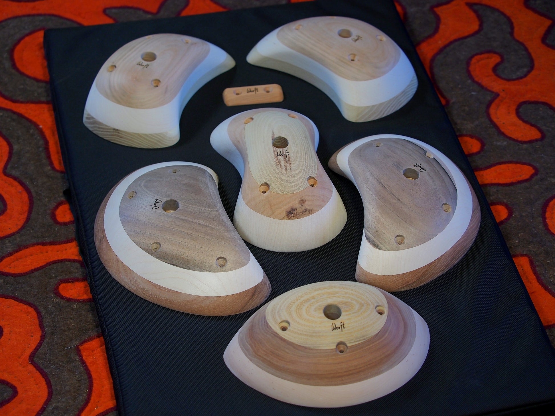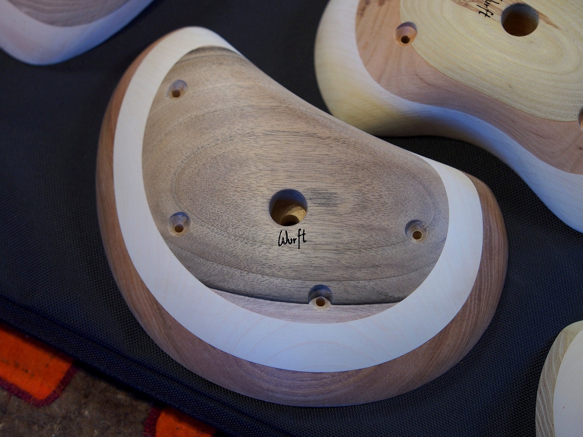 All holds are made from locally sourced hardwood (except the crimp) and can be used as screw-on holds. Big holds also have a hole for an M10 countersunk bolt. Hardware is not included.